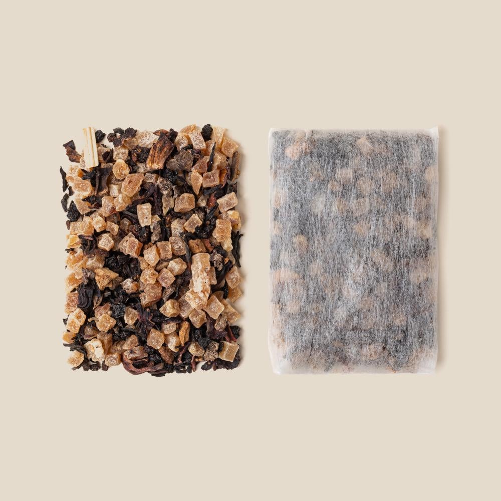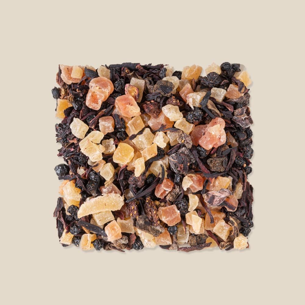 candied pineapple bits (pineapple, sugar), black tea, candied papaya bits (papaya, sugar), hibiscus blossoms, elderberries, beetroot bits, natural flavouring (guava and strawberry taste), strawberry bits, guava bits, vanilla bits